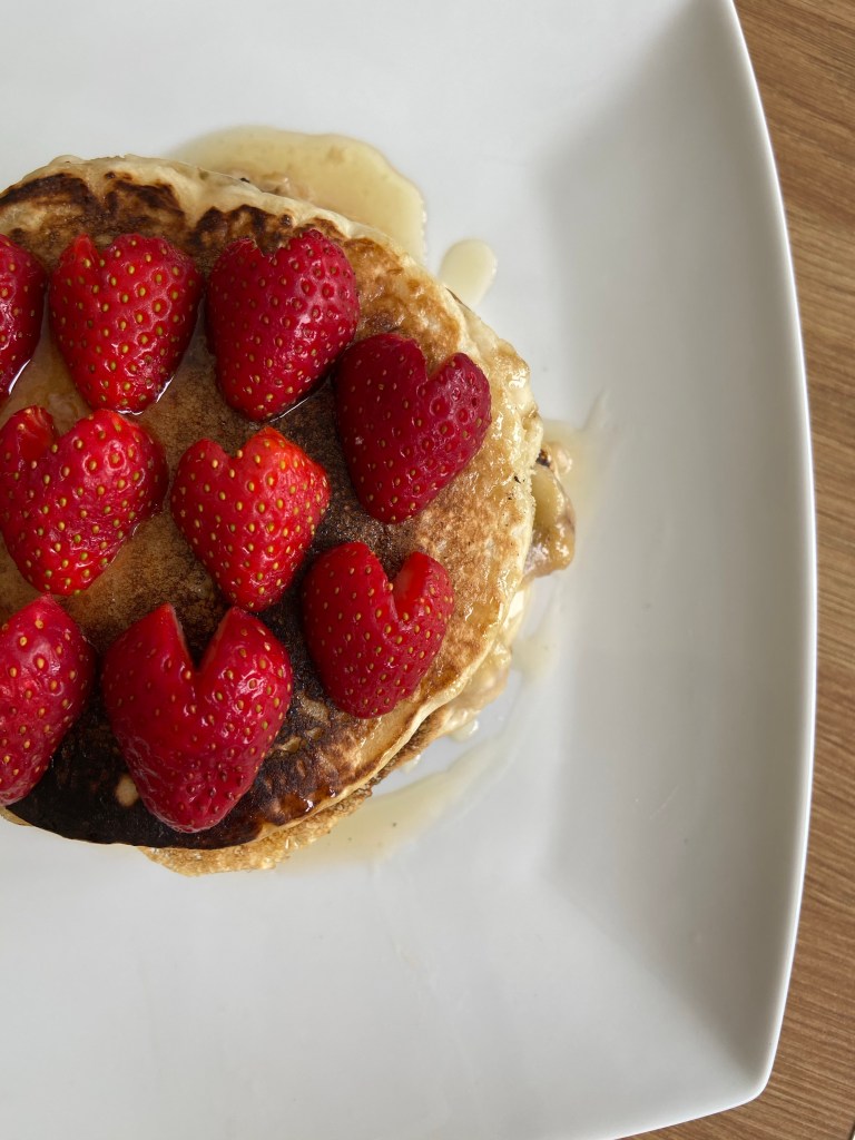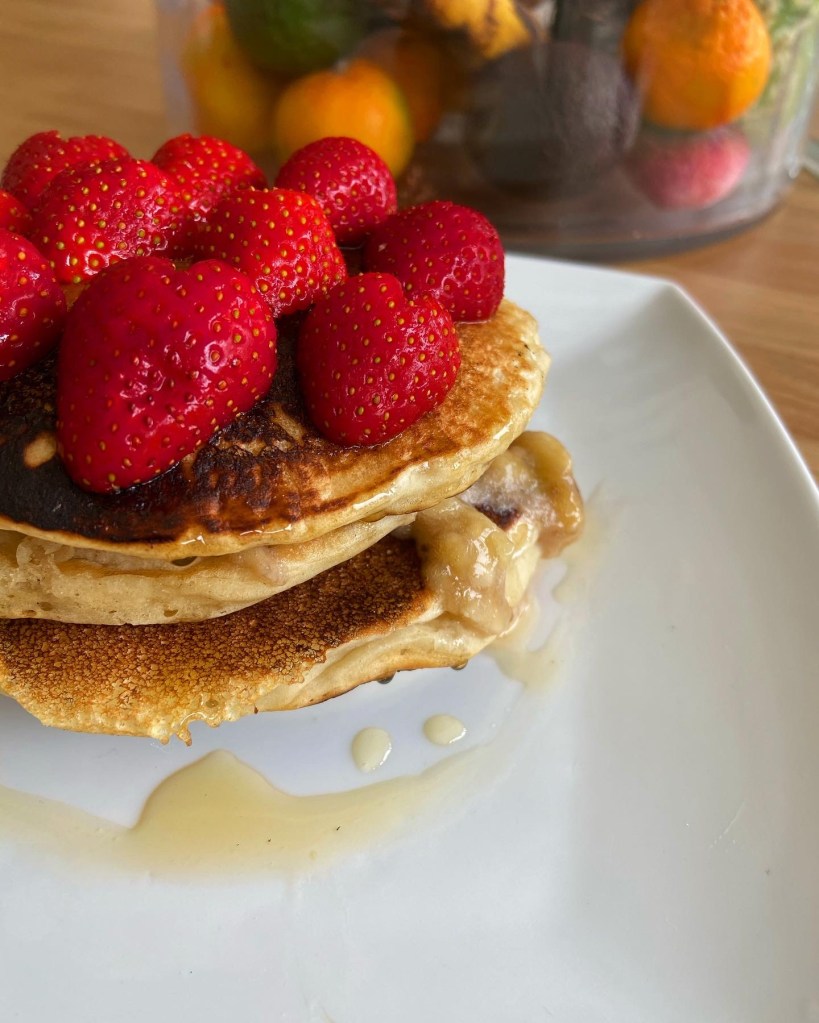 Delicious vegan pancakes with ingredients that you will already have in your kitchen. 300 calories without toppings. This recipe serves 2 people.