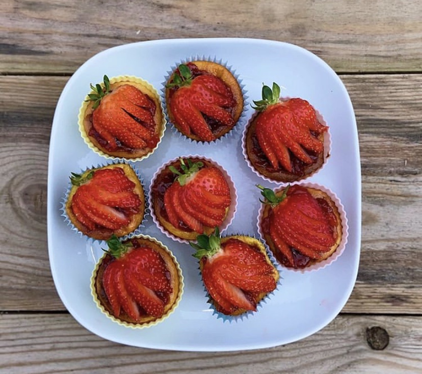 5) Remove the cheesecakes from the tin and top with jam and strawberries. Enjoy😁