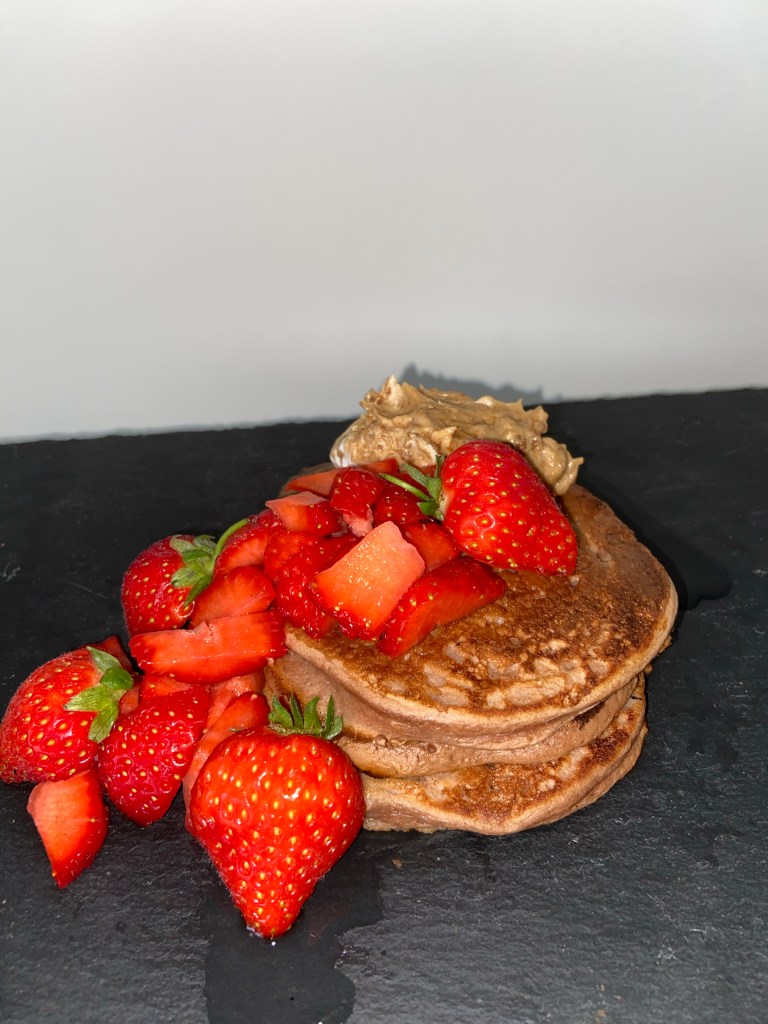 3) Stack and partner with selected toppings. I used a zero calorie caramel syrup, strawberries and biscoff spread mixed with Greek yoghurt to top.