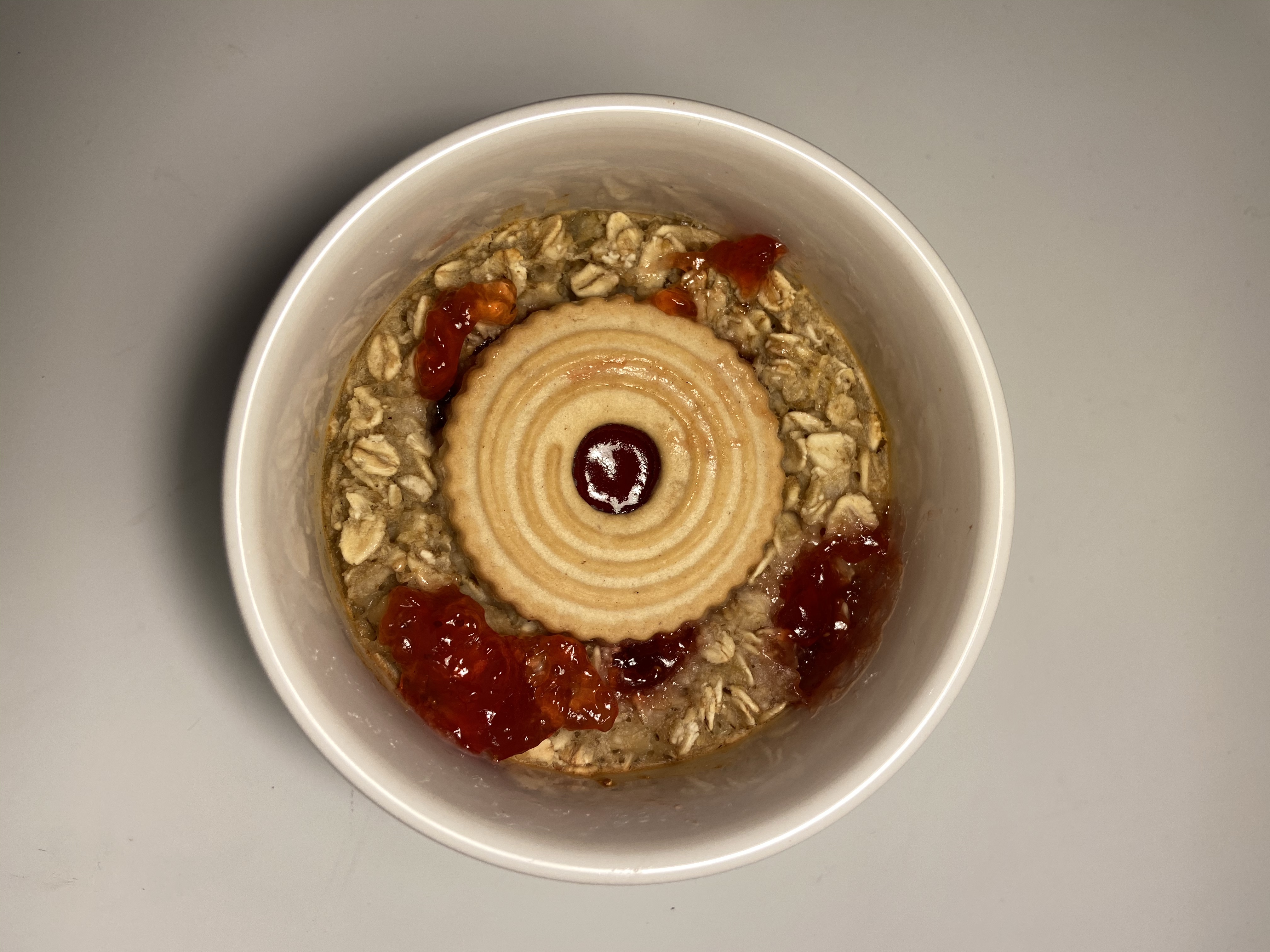 4) Spoon little bits of jam evenly on top and place a jammy dodger in the centre.